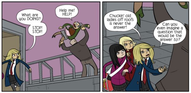 | Bad Machinery is a webcomic set in the fictional town of Tackleford, England, written and drawn by John Allison. The story involves two groups of schoolchildren that attend fictional “Griswalds Grammar School” who spend their time solving mysteries. The groups interact, but each is unaware of that the other group is out solving mysteries, just like they are. Rest assured thouhg, the whole thing is far less “Fantastic Five” than it sounds. This strip has humour, action and mystery all with a very British sensibility to it. Visually, Allison’s artwork is a joy to look at. There is detail (such as in the background scenery) but the overall feeling is simplified and not too over-drawn. (By the way, I have no idea why this comic is called Bad Machinery. If you do, please let me know in the comments below). |